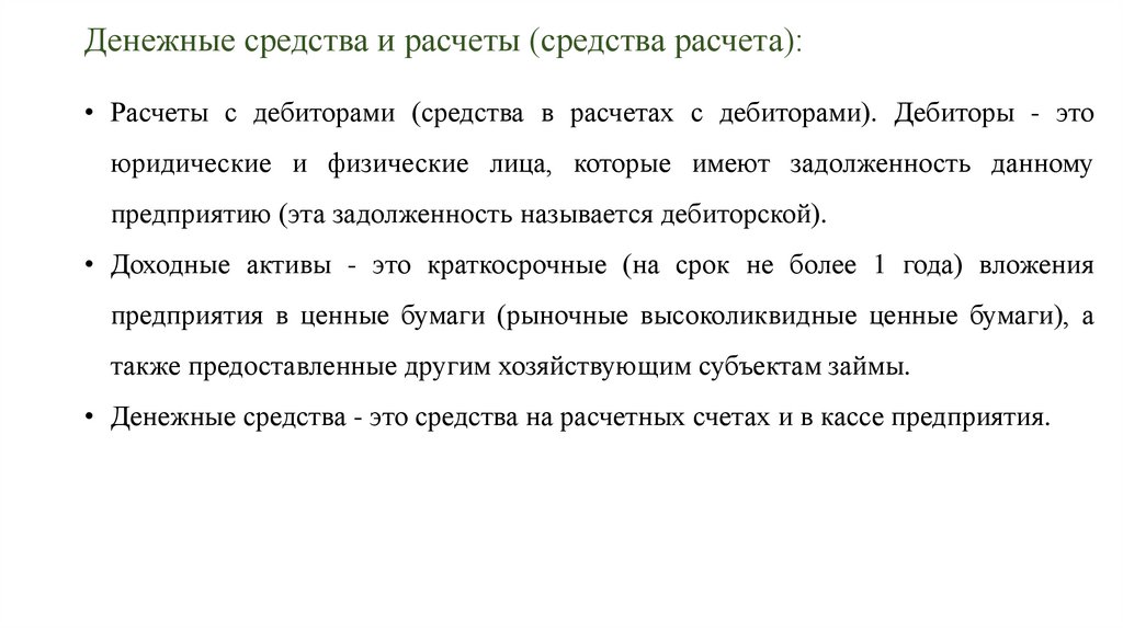 • Денежные средства - это средства на расчетных счетах и в кассе предприятия.