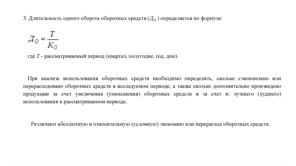 3. Длительность одного оборота оборотных средств (ДО ) определяется по формуле:где Т - рассматриваемый период (квартал, полугодие, год, дни).