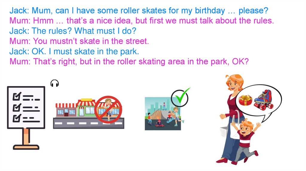 Jack: Mum, can I have some roller skates for my birthday … please?Mum: Hmm … that’s a nice idea, but first we must talk about the rules.