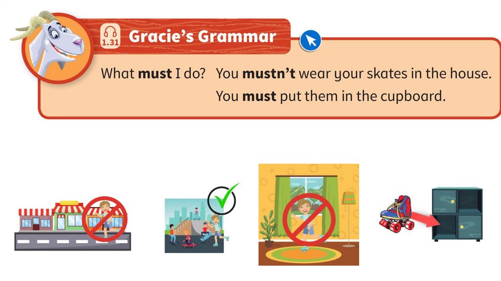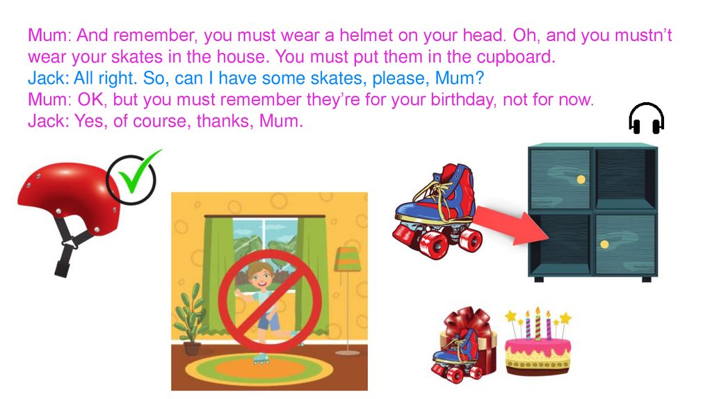 Mum: And remember, you must wear a helmet on your head. Oh, and you mustn’twear your skates in the house. You must put them in the cupboard.
