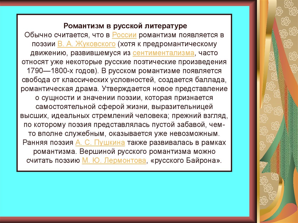 Романтизм в русской литературеОбычно считается, что в России романтизм появляется в