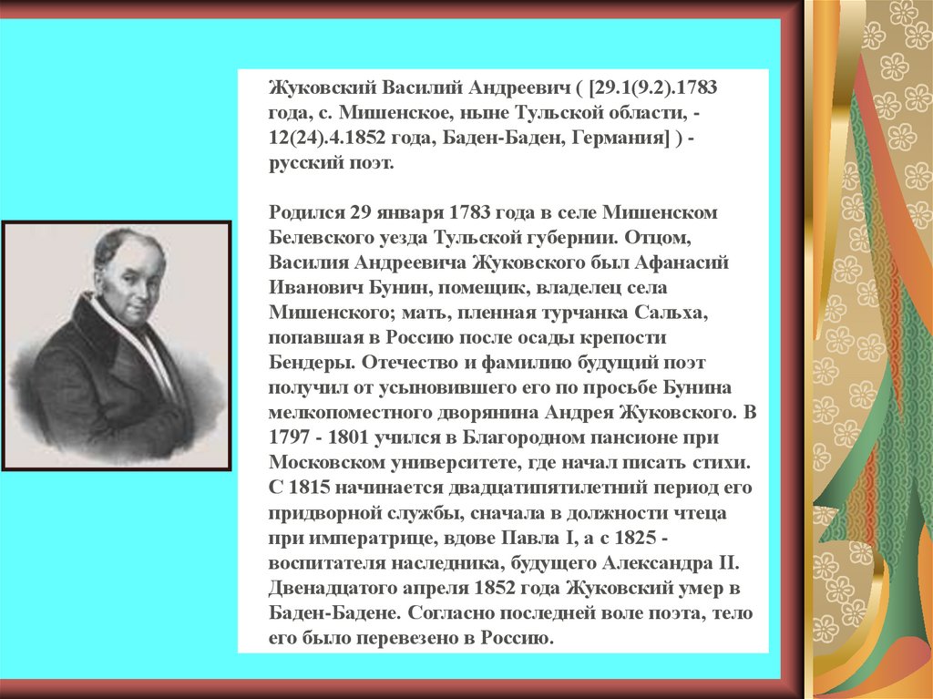 Жуковский Василий Андреевич ( [29.1(9.2).1783года, с. Мишенское, ныне Тульской области, 12(24).4.1852 года, Баден-Баден, Германия] ) русский поэт.
