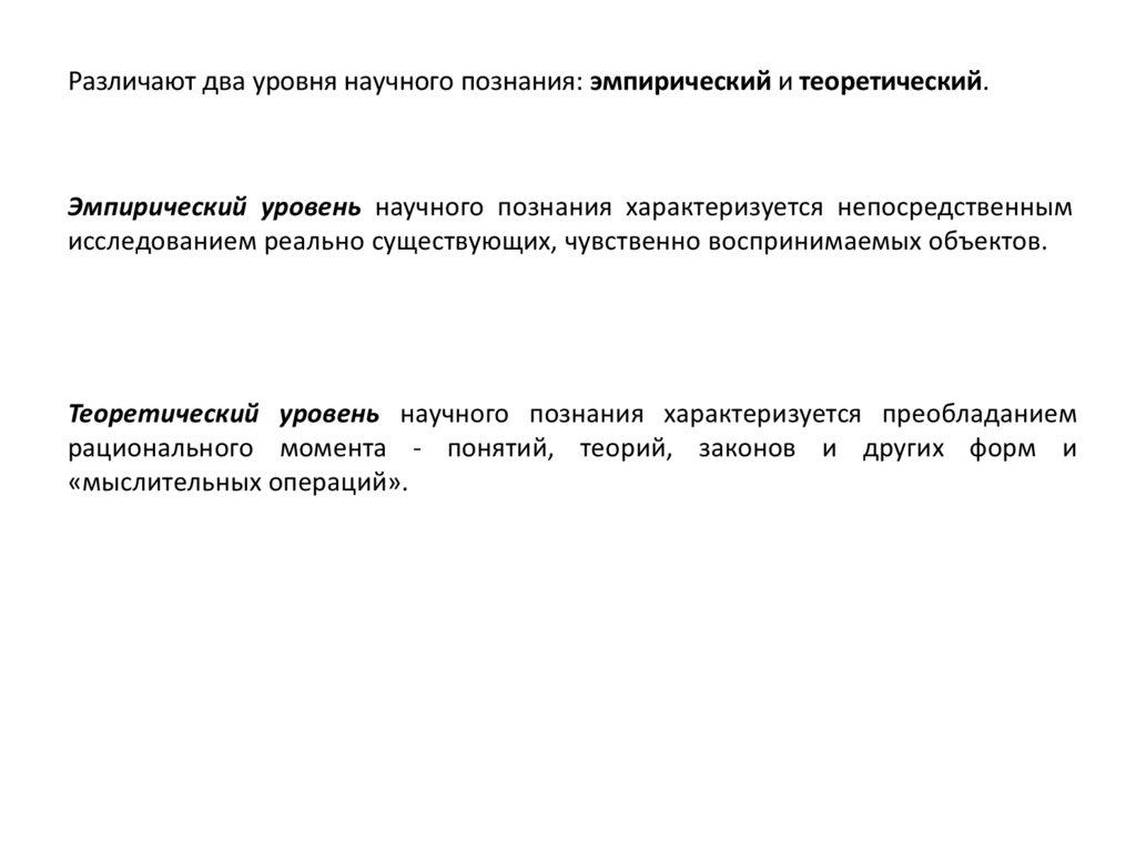 Различают два уровня научного познания: эмпирический и теоретический.Эмпирический уровень научного познания характеризуется непосредственным