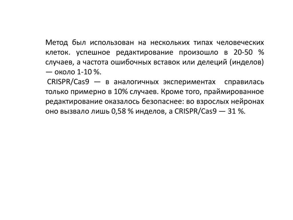 Метод был использован на нескольких типах человеческихклеток. успешное редактирование произошло в 20-50 %