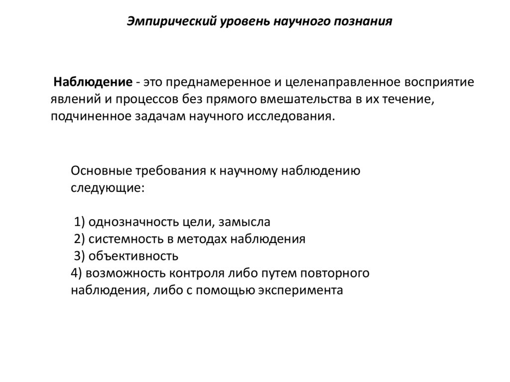 Эмпирический уровень научного познанияНаблюдение - это преднамеренное и целенаправленное восприятие