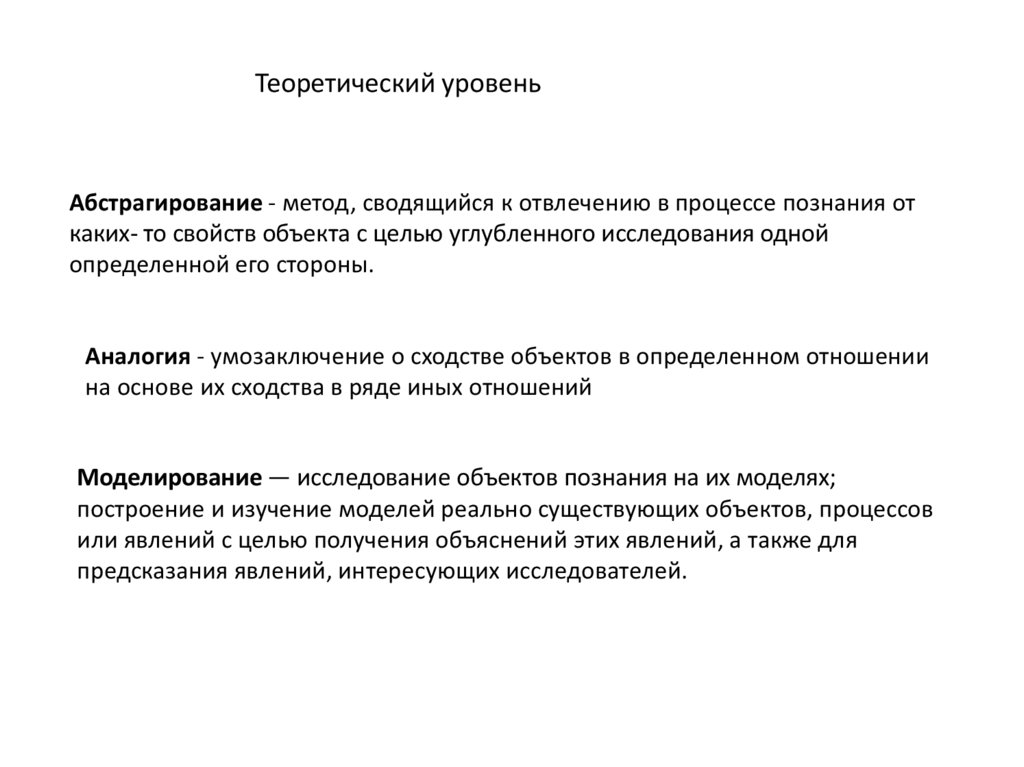 Теоретический уровеньАбстрагирование - метод, сводящийся к отвлечению в процессе познания от