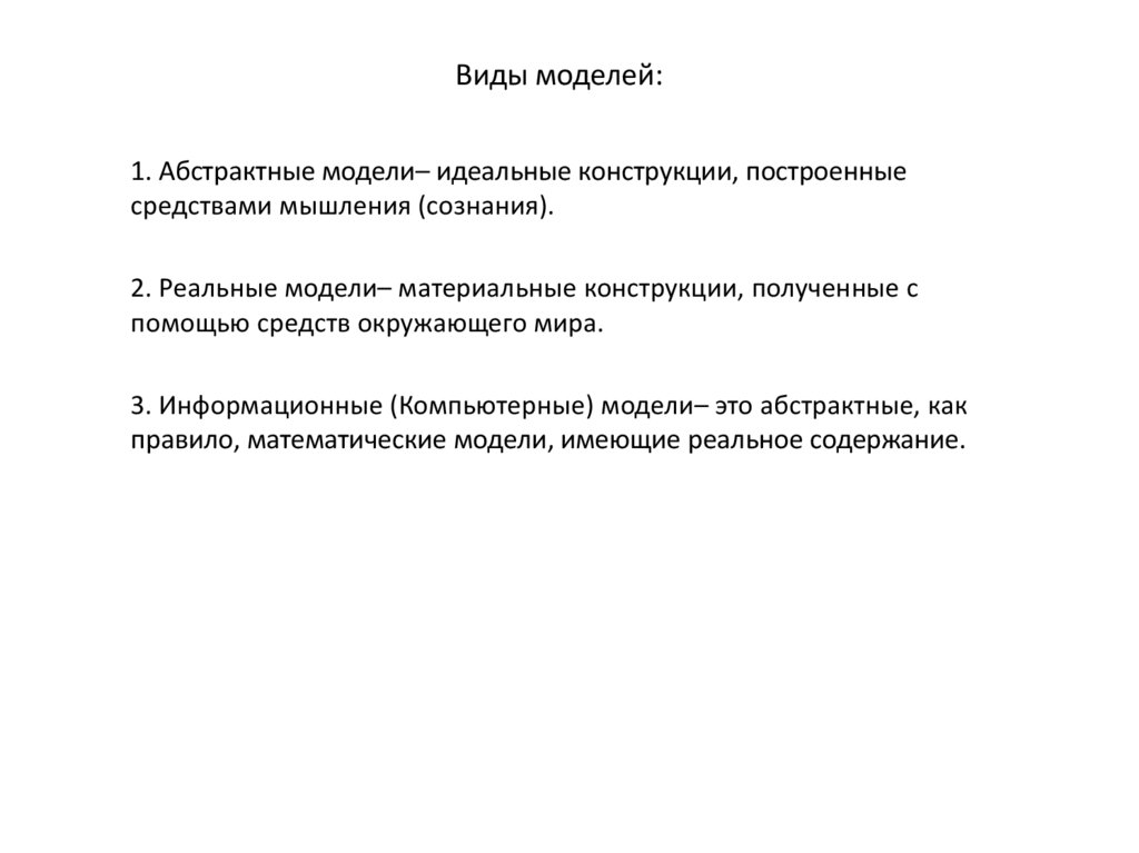 Виды моделей:1. Абстрактные модели– идеальные конструкции, построенные