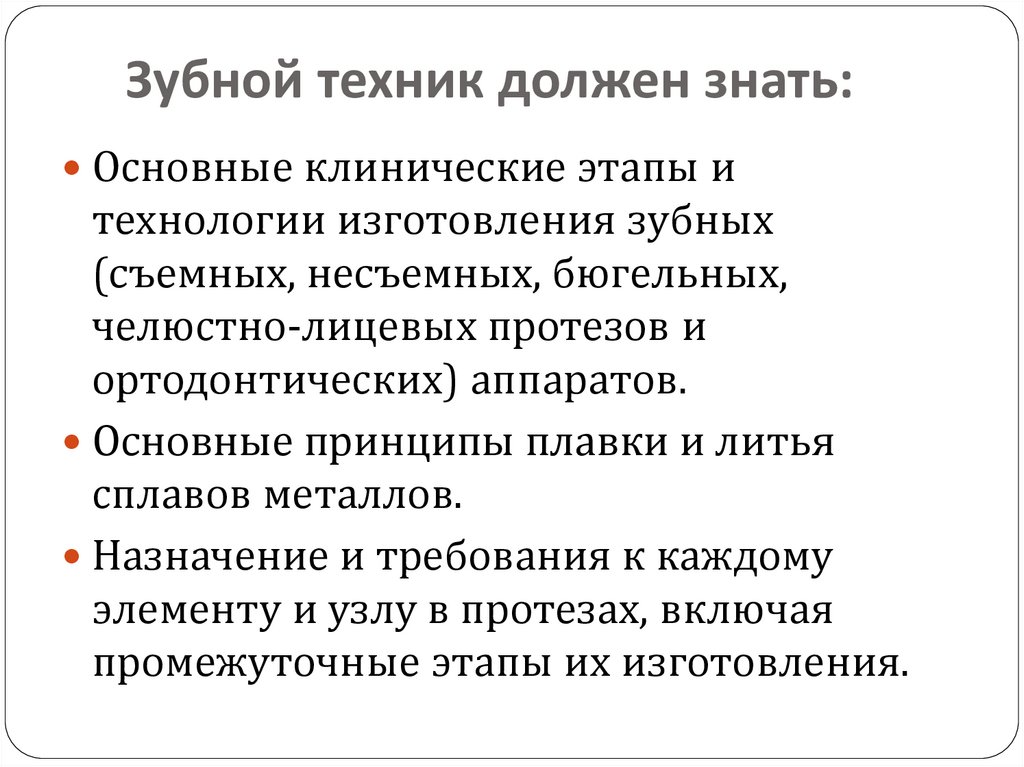 Зубной техник должен знать:Основы строения и функций зубочелюстной системы,