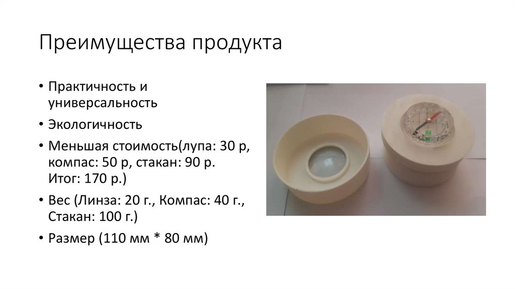 • Вес (Линза: 20 г., Компас: 40 г.,