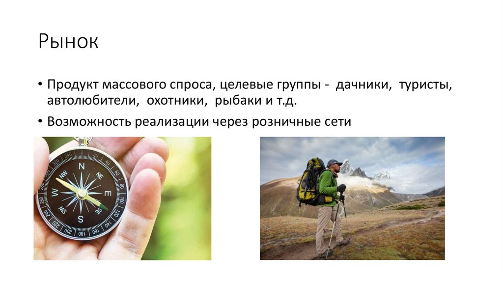 Рынок• Продукт массового спроса, целевые группы - дачники, туристы,