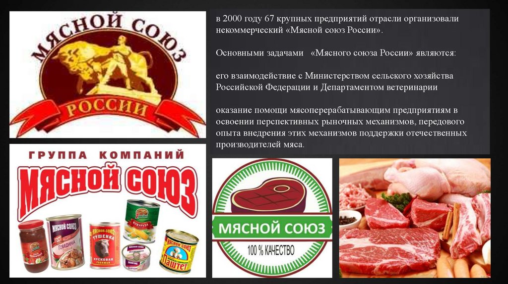в 2000 году 67 крупных предприятий отрасли организовалинекоммерческий «Мясной союз России».