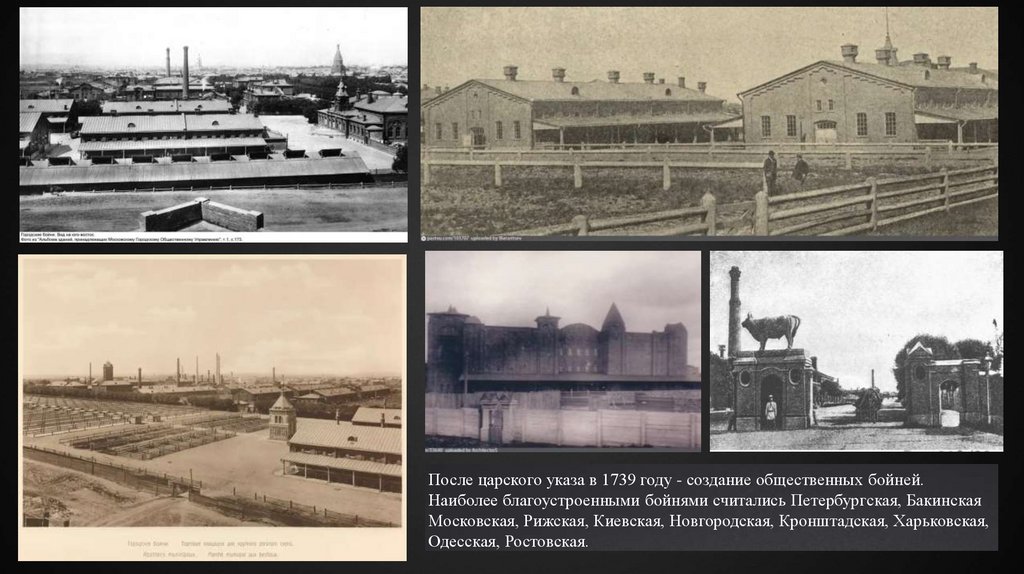После царского указа в 1739 году - создание общественных бойней.Наиболее благоустроенными бойнями считались Петербургская, Бакинская