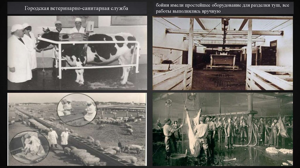 Городская ветеринарно-санитарная службабойни имели простейшее оборудование для разделки туш, все