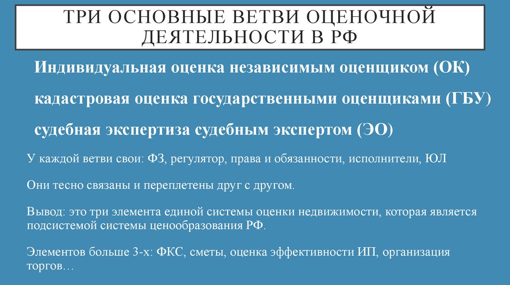 ТРИ ОСНОВНЫЕ ВЕТВИ ОЦЕНОЧНОЙДЕЯТЕЛЬНОСТИ В РФ