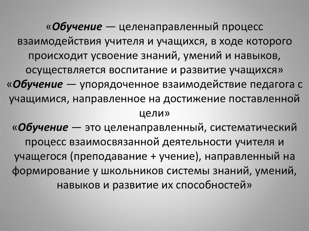 «Обучение — целенаправленный процессвзаимодействия учителя и учащихся, в ходе которого