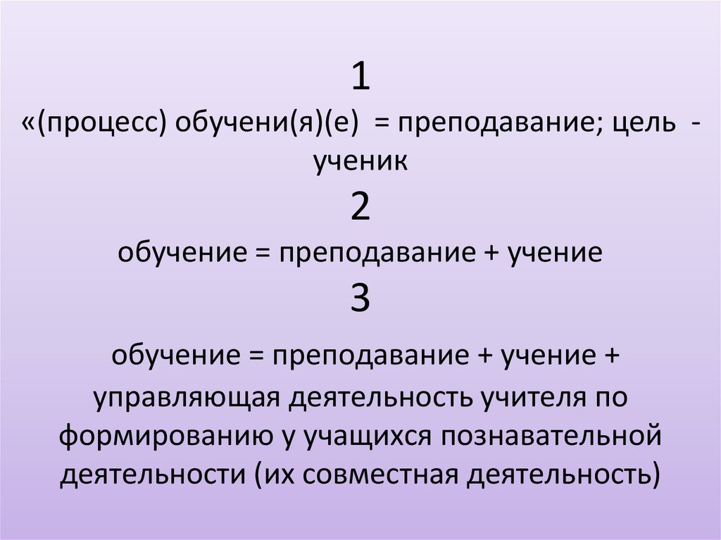 1«(процесс) обучени(я)(е) = преподавание; цель ученик