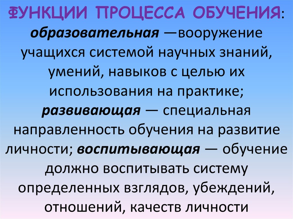 ФУНКЦИИ ПРОЦЕССА ОБУЧЕНИЯ:образовательная —вооружение