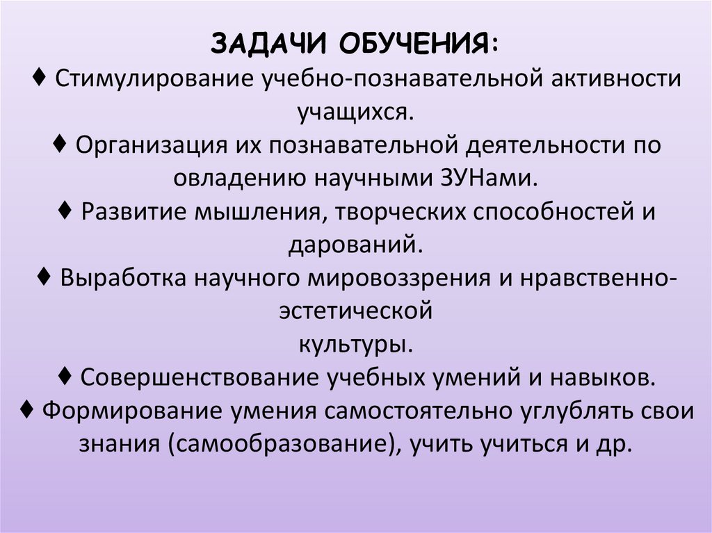 ЗАДАЧИ ОБУЧЕНИЯ:♦ Стимулирование учебно-познавательной активности