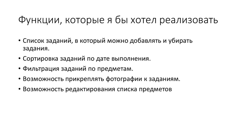Функции, которые я бы хотел реализовать• Список заданий, в который можно добавлять и убирать