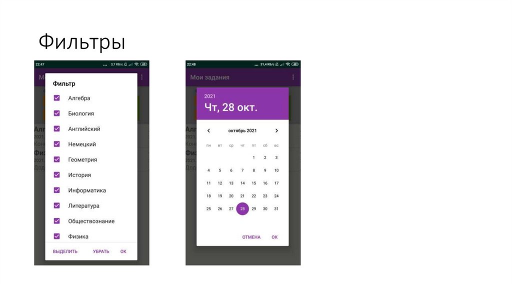 • Фильтрация заданий по предметам.