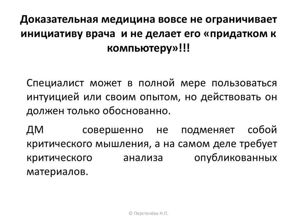 Доказательная медицина вовсе не ограничиваетинициативу врача и не делает его «придатком к