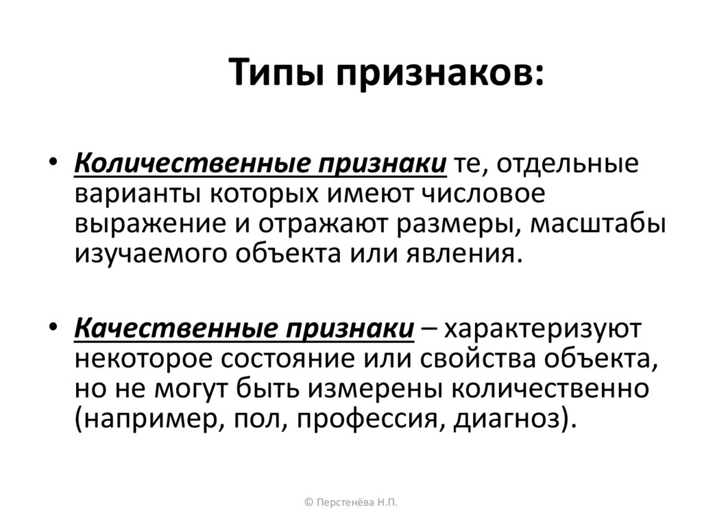 Типы признаков:• Количественные признаки те, отдельные