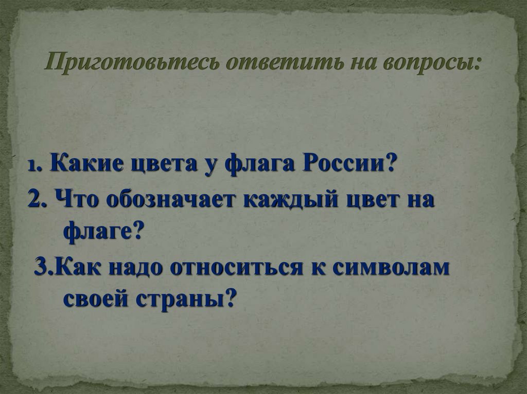 1. Какие цвета у флага России?2. Что обозначает каждый цвет на