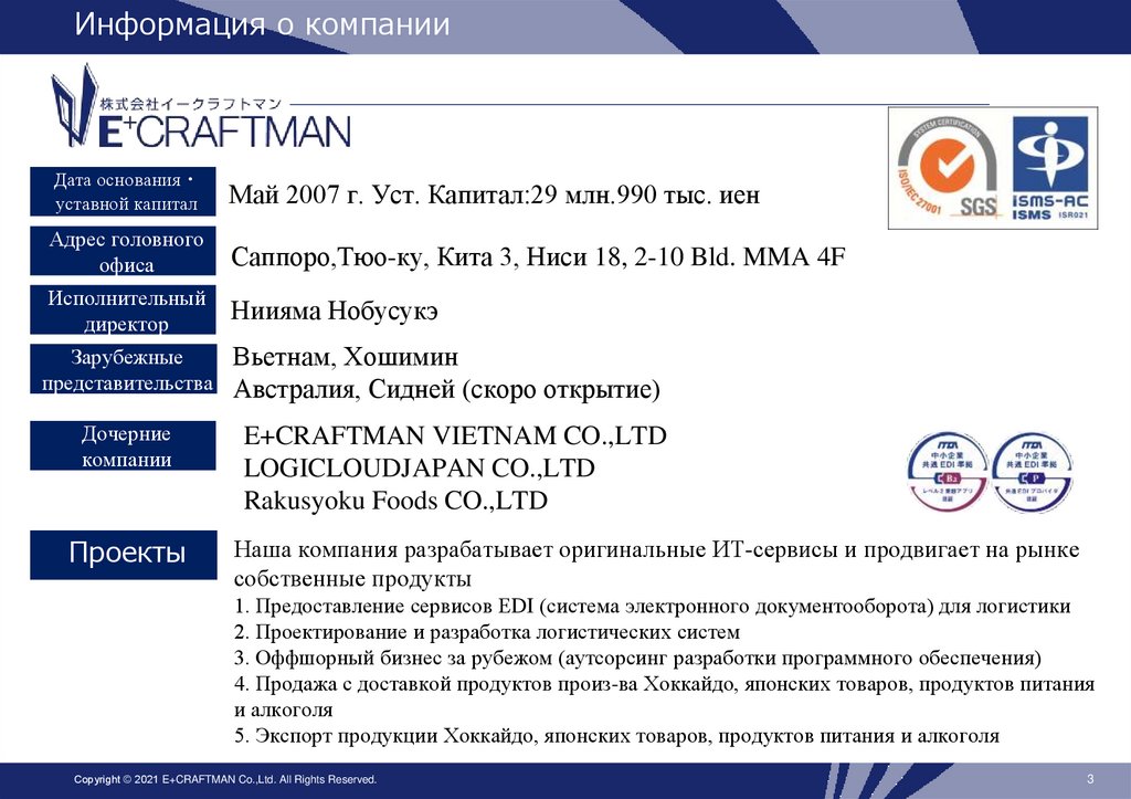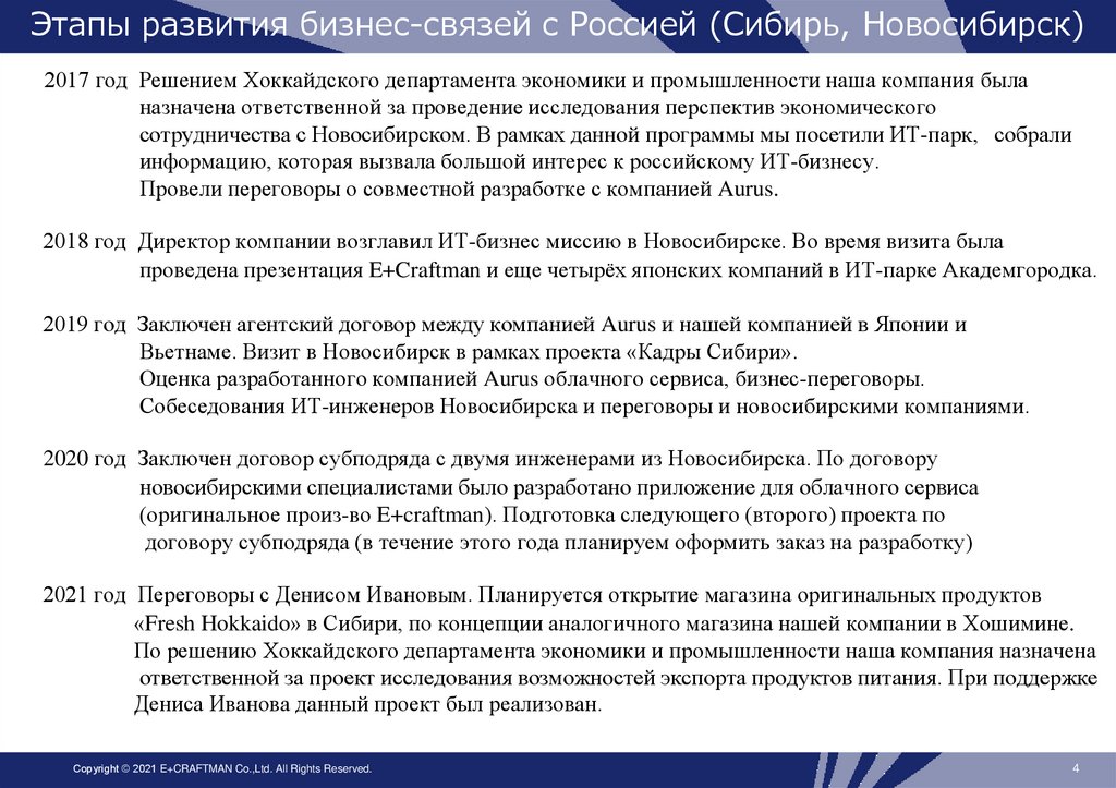 Этапы развития бизнес-связей с Россией (Сибирь, Новосибирск)2017 год Решением Хоккайдского департамента экономики и промышленности наша компания была