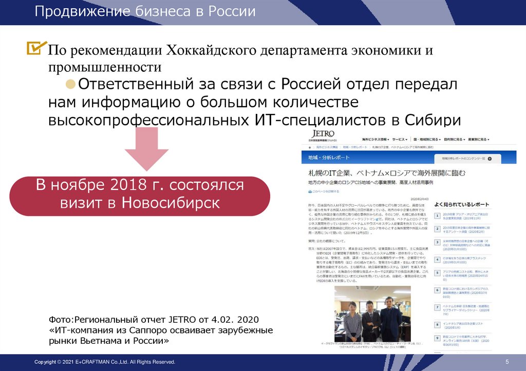 Продвижение бизнеса в РоссииПо рекомендации Хоккайдского департамента экономики и