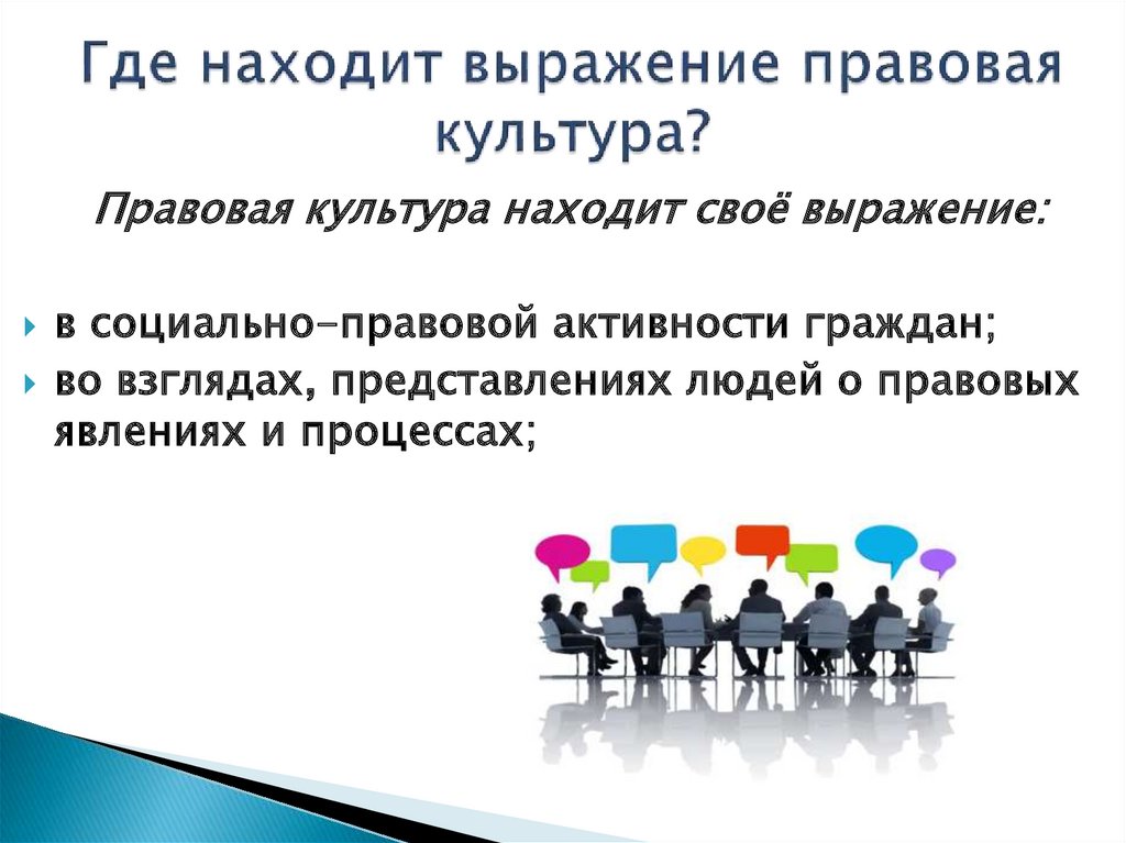 Правовая культура находит своё выражение:в социально-правовой активности граждан;