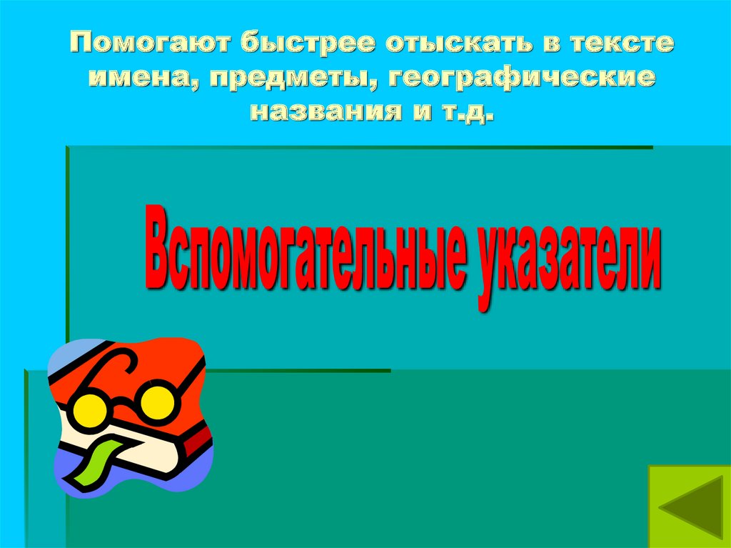 Помогают быстрее отыскать в текстеимена, предметы, географические