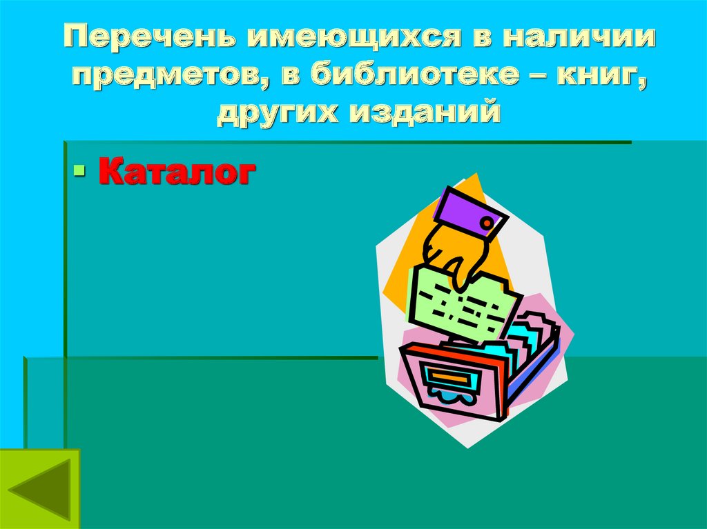 Перечень имеющихся в наличиипредметов, в библиотеке – книг,