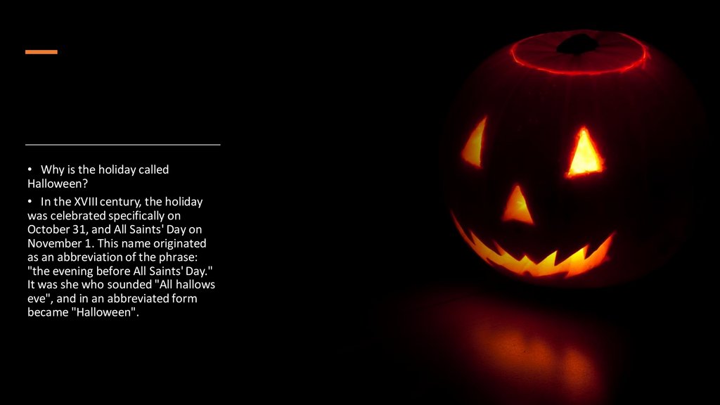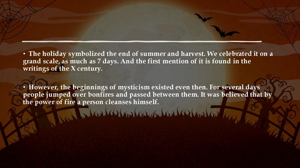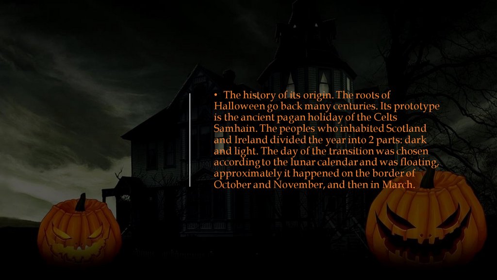 • The history of its origin. The roots ofHalloween go back many centuries. Its prototype