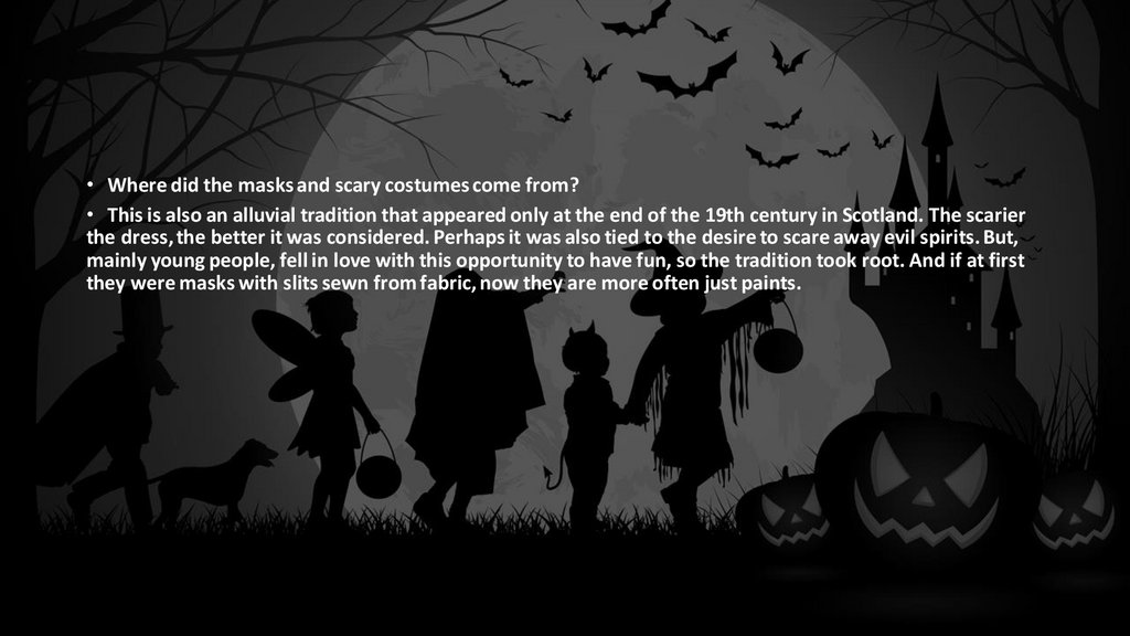 • Where did the masks and scary costumes come from?• This is also an alluvial tradition that appeared only at the end of the 19th century in Scotland. The scarier