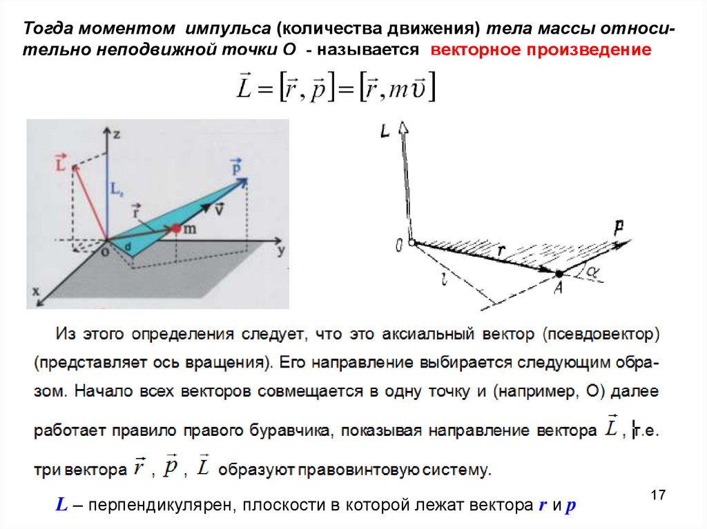 Тогда моментом импульса (количества движения) тела массы относительно неподвижной точки О - называется векторное произведениеL – перпендикулярен, плоскости в которой лежат вектора r и p