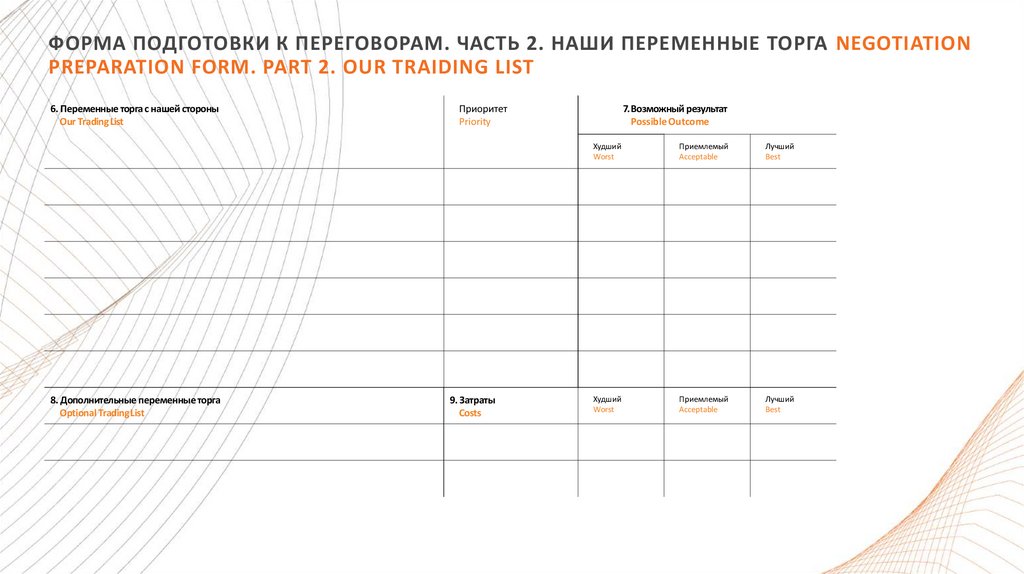 ФОРМА ПОДГОТОВКИ К ПЕРЕГОВОРАМ. ЧАСТЬ 2. НАШИ ПЕРЕМЕННЫЕ ТОРГА NEGOTIATIONPREPARATION FORM. PART 2. OUR TRAIDING LIST