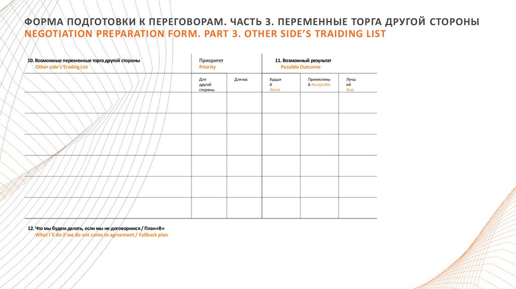ФОРМА ПОДГОТОВКИ К ПЕРЕГОВОРАМ. ЧАСТЬ 3. ПЕРЕМЕННЫЕ ТОРГА ДРУГОЙ СТОРОНЫNEGOTIATION PREPARATION FORM. PART 3. OTHER SIDE’S TRAIDING LIST