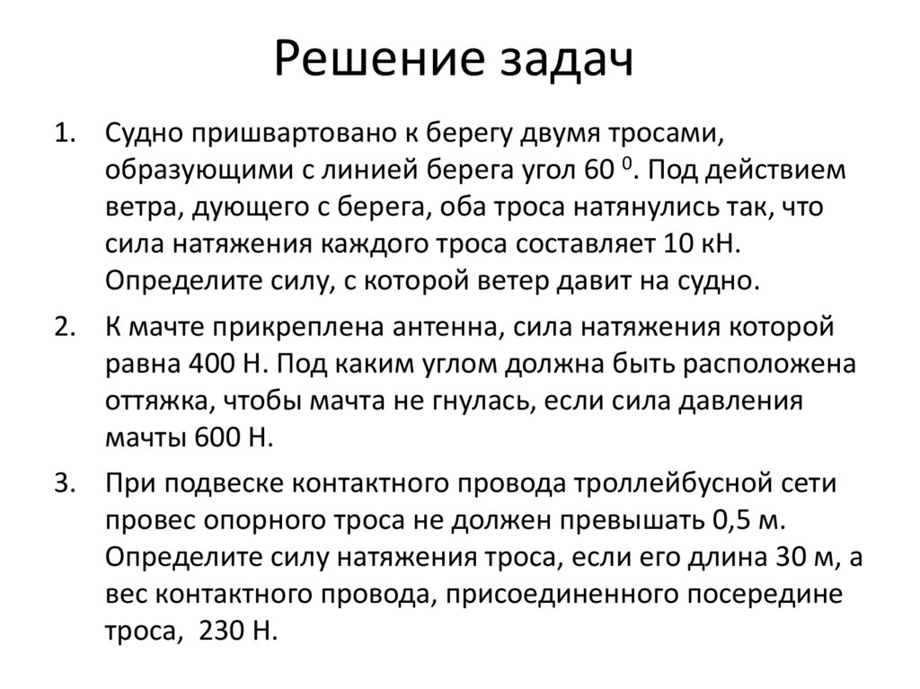 Решение задач1. Судно пришвартовано к берегу двумя тросами,