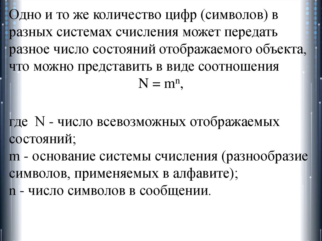 Одно и то же количество цифр (символов) вразных системах счисления может передать