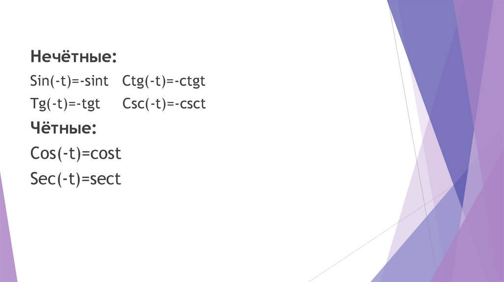 Нечётные:Sin(-t)=-sint Ctg(-t)=-ctgt