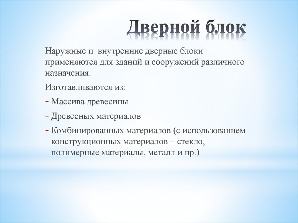 1. Назначение дверных блоков. Материалы для их изготовления.