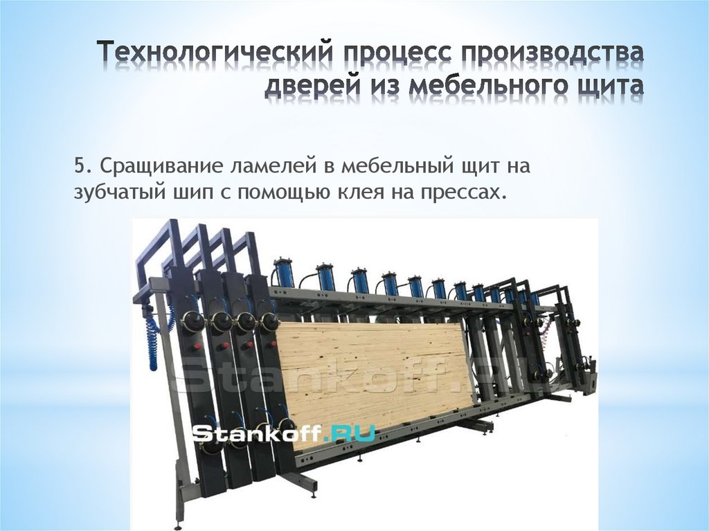 5. Сращивание ламелей в мебельный щит назубчатый шип с помощью клея на прессах.