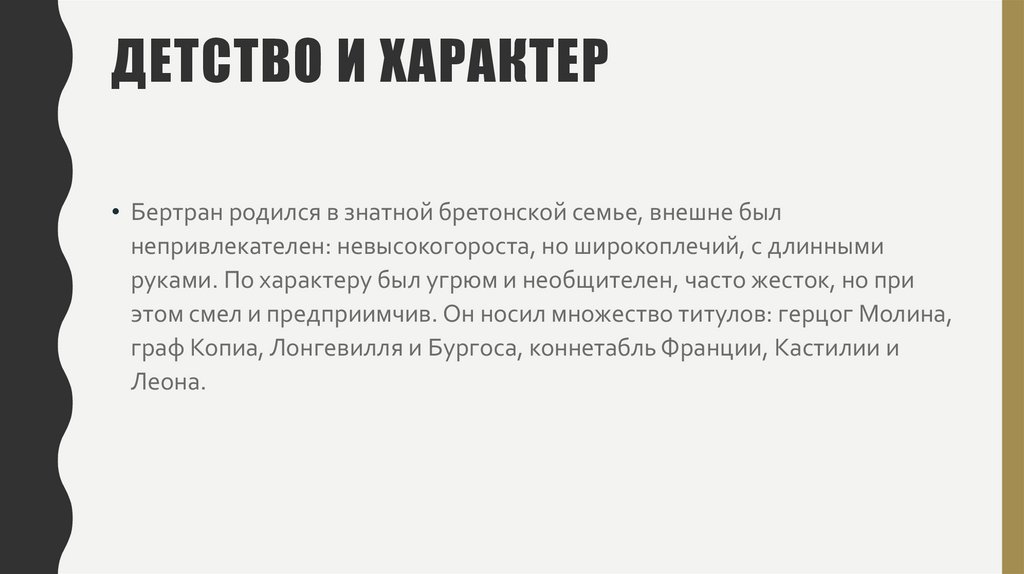 ДЕТСТВО И ХАРАКТЕР• Бертран родился в знатной бретонской семье, внешне был