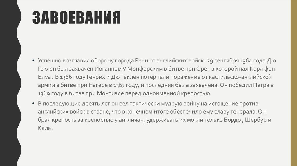 ЗАВОЕВАНИЯ• Успешно возглавил оборону города Ренн от английских войск. 29 сентября 1364 года Дю