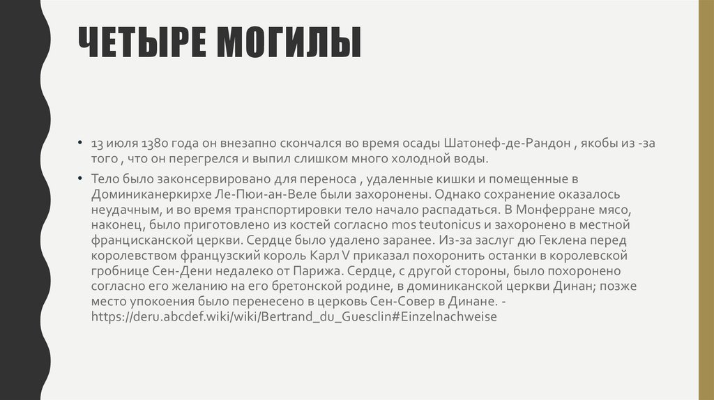 ЧЕТЫРЕ МОГИЛЫ• 13 июля 1380 года он внезапно скончался во время осады Шатонеф-де-Рандон , якобы из -за