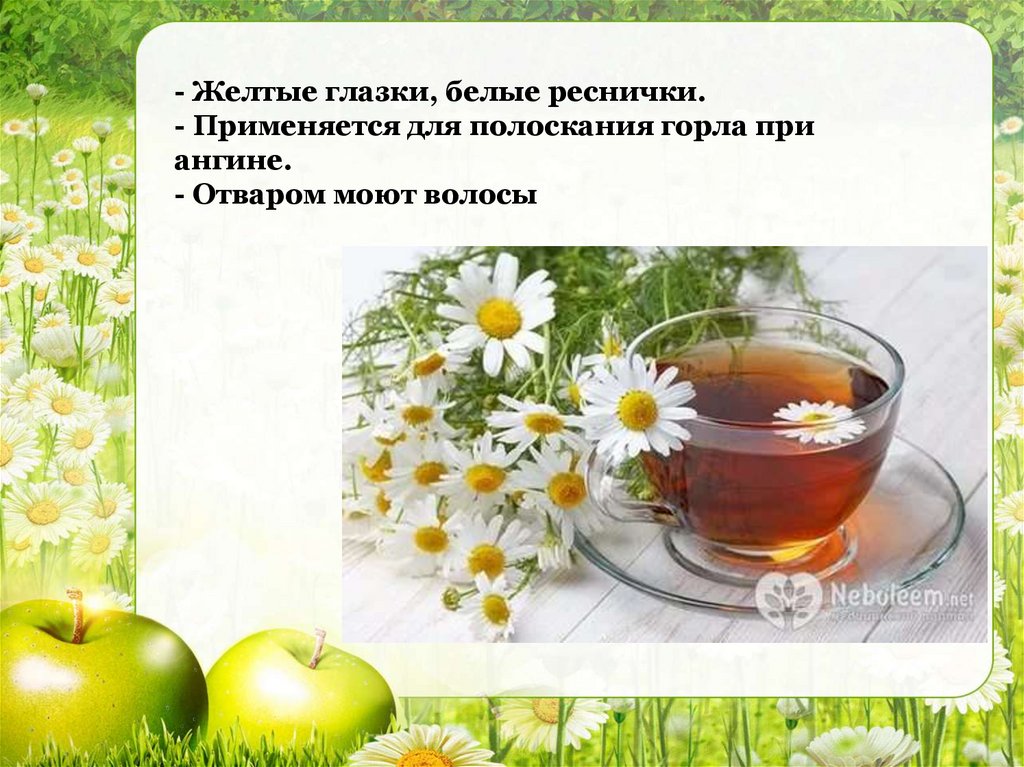 - Желтые глазки, белые реснички.- Применяется для полоскания горла при