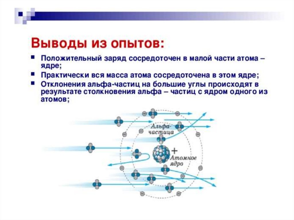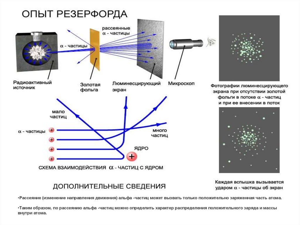 •Рассеяние (изменение направления движения) альфа -частиц может вызвать только положительно заряженная часть атома.•Таким образом, по рассеянию альфа -частиц можно определить характер распределения положительного заряда и массы