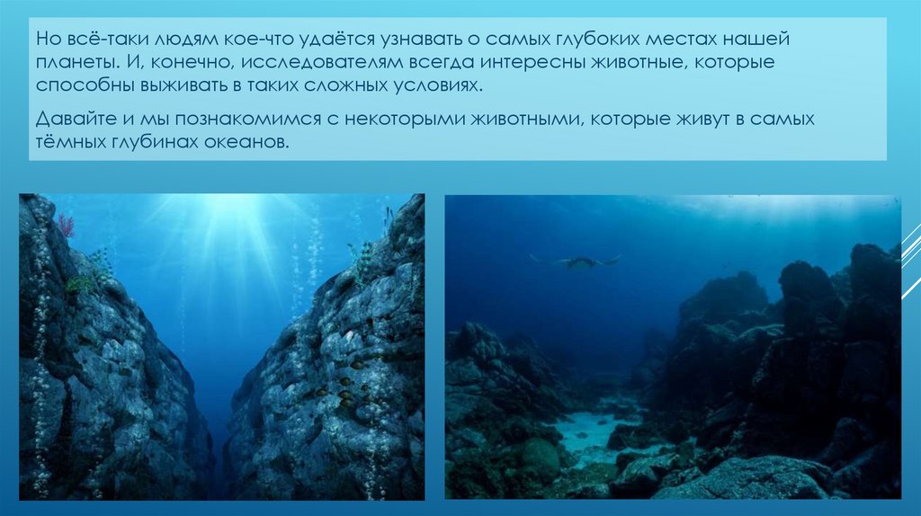 Но всё-таки людям кое-что удаётся узнавать о самых глубоких местах нашейпланеты. И, конечно, исследователям всегда интересны животные, которые