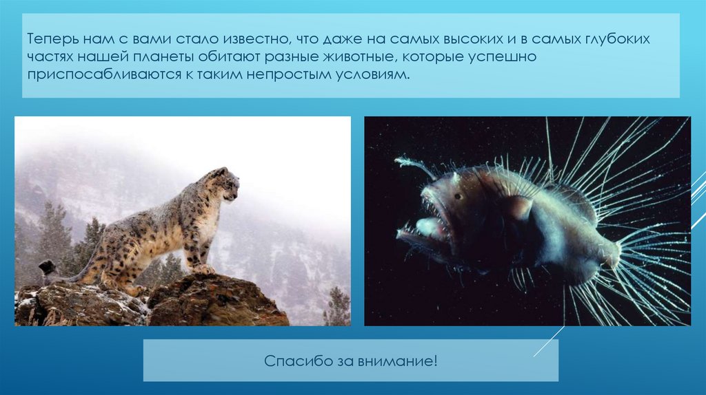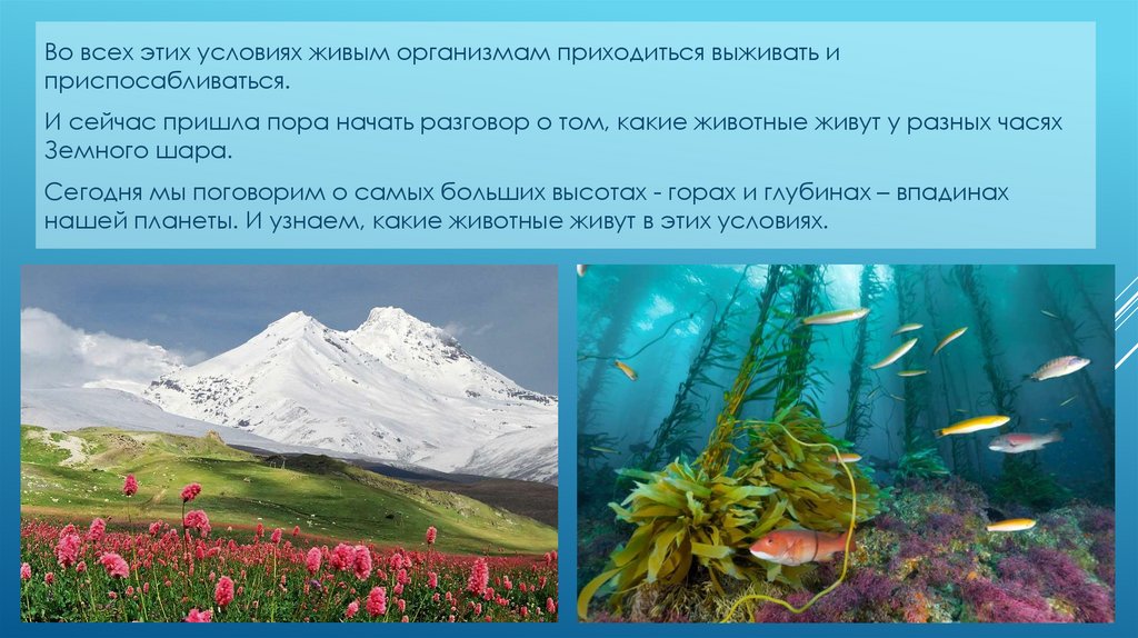 Теперь нам с вами стало известно, что даже на самых высоких и в самых глубокихчастях нашей планеты обитают разные животные, которые успешно