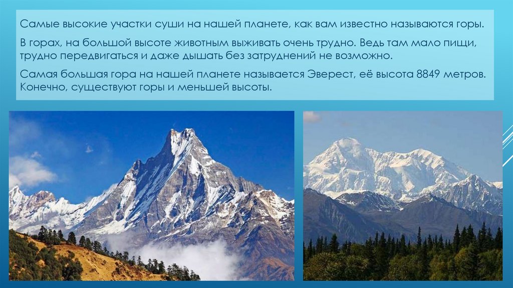 Самые высокие участки суши на нашей планете, как вам известно называются горы.В горах, на большой высоте животным выживать очень трудно. Ведь там мало пищи,